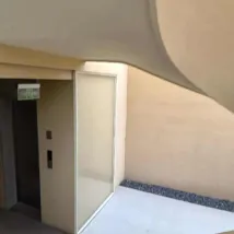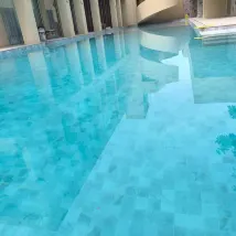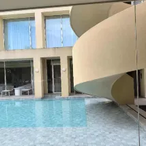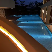 Винтовая лестница и весь бассейн становятся еще более очаровательными при ночной подсветке.