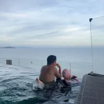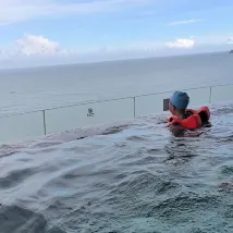 Разместив багаж, мы отправились в лобби, чтобы выпить приветственный напиток, наслаждаясь вечерним бризом. Ребенок не мог дождаться, чтобы пойти купаться. Как семейный курорт, отель просто обязан иметь такой инфинити-бассейн на 15-м этаже – его обязательно нужно посетить! Вечером было немноголюдно. Купаться и любоваться великолепным видом, где небо сливается с морем, на закате 🌄 было невероятно умиротворяюще ❤️. Дезинфицированные полотенца всегда были доступны, так что не нужно было беспокоиться, если забыли свой халат или банное полотенце.