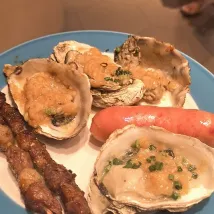 Проходя мимо отельного барбекю-бара, чуть после девяти, мы подумали, что можно заказать поздний ужин-барбекю и подошли спросить. Однако сотрудник сказал, что они только что закончили работать. Когда мы уже собирались уходить, парень-шашлычник сказал: "Пожалуйста, попробуйте!" — и протянул нам половину последних шашлыков, которые он только что приготовил. Мы неожиданно получили такой теплый и душевный момент 🍢🎆. Это было так приятно и счастливо 🥰!
