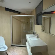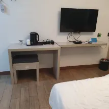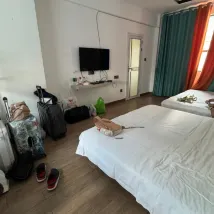 Номер довольно маленький. Ну, все есть двуспальная кровать. Маленький санузел с душем в углу. Телевизор, кондиционер. Чайник с 2 чашками. Номер прокуренный, очень пахло табаком. К сожалению, когда мы приехали поздно ночью, ближе к утру, с трудом нашли человека на ресепшене, пришлось звонить через trip.com.