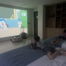 В номере чисто и гигиенично: есть жидкое мыло Walch, умный унитаз, качественные зубные щетки. Проекционный экран с отличным изображением и звуком, управление через умного помощника.