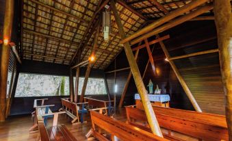 A pousada está em um belíssimo lugar e tem bastante área verde.