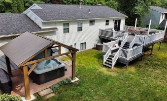 Centrally located, spacious 5 bedroom home in the heart of Saratoga Springs. Completely renovated with amenities for all to enjoy. Enjoy the 6 person hot tub which is open year round and relax on the oversized deck with two seating areas and a large outdoor dining space and a large grill. After a long day of exploring, you’ll enjoying roasting marshmallows over an open fire pit and taking a dip in the hot tub while you enjoy stargazing.