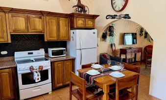 Inside, you’ll find everything you need to feel at home. The spacious living area is kept refreshingly cool with air conditioning and features fast, reliable Wi-Fi—perfect for streaming movies or catching up on work at the dedicated workspace. Prepare delicious meals using the fully equipped kitchen, complete with an oven, blender, coffee maker, toaster, and all the essential cookware. Savor your creations at the indoor dining table or step out onto your private patio to dine under the stars, glass of wine in hand.