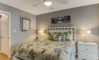 Just up the stairs is a full bathroom with a shower/bath, 2 bedrooms and a laundry room with a full size front loading washer and dryer. Both bedrooms have queen beds, white linens, white wood furniture, and natural light from the windows makes the space clean, inviting and fresh. There are ceiling fans, big closets and 24 inch televisions in each bedroom. Each bedroom has bedside lamps with USB ports for convenient cell phone charging. The cellular window shades offer both light filtering or total blackout options.