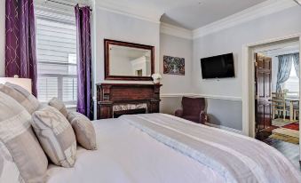 The home's king bedroom truly dazzles with comfort and elegance. Feel the charm and ambiance of a king-sized bed surrounded by an antique fireplace, gorgeous dresser, night tables, and wall-mounted television. There's also a private closet. The home's bright and airy second bedroom features a queen-sized bed with an en-suite bathroom with full-sized shower/tub combo. A second half-style bathroom is located off of the main living area.