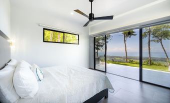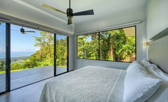 Relax and enjoy the sounds of nature while marveling at the spectacular ocean views in this brand-new vacation home perched high on a mountain ridge overlooking the Pacific coast. Located halfway between Manuel Antonio / Quepos and Dominical, 3 hours from San Jose (SJO) airport, the home has 3 bedrooms - 2 king beds 1 queen bed - and 3 full baths, all bedrooms and the living room have air conditioning. 4 wheel drive is required to get to the home. The home has WiFi (100Mbps) with fiber optic internet, and a fully stocked kitchen and coffee area with espresso, regular coffee, decaf, and assorted teas. The property is very private and peaceful. Home has private gate, security system, and neighborhood has a nighttime security guard for added safety, though this is a very safe area.