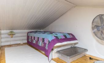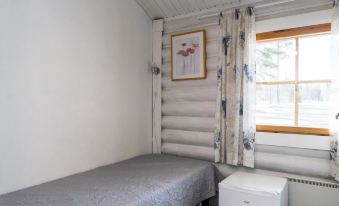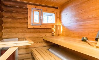 Round-log semi-detached apartment built in 1985, features a kitchenette (renovated in 2021), bedroom with a double bed, sleeping alcove with one bed, living room with sofa bed (145 cm x 195 cm when opened), loft with two mattresses accessed via steep stairs, washroom with shower and WC, electric sauna (washroom and sauna renovated in 2012), and a covered porch.