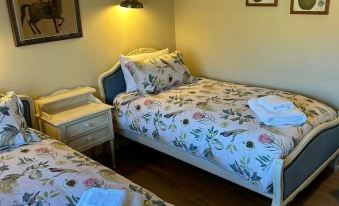 The Hayloft has a grand hallway which leads to a Super-King sized bedroom with an ensuite. A twin room with French Antique Continental beds, a bathroom, and a separate toilet. A private room for a work area with desk.