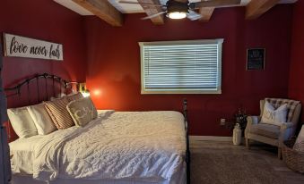 The main floor has one bedroom with a king size bed, and deluxe bathroom (including jacuzzi and large tile shower.) It’s the perfect romantic getaway for honeymooners, or an anniversary, but there is also space to bring several couples or some friends! The kitchen, main living area and dining table are on the main floor. The kitchen is well stocked with utensils, and the basics for cooking. There is also a beautiful gas fireplace on the main floor.