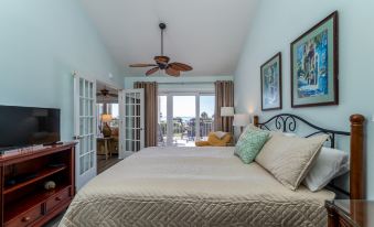 This villa has two bedrooms, both with private baths. The master bedroom sits behind French doors. A comfortable king bed, ceiling fan and Smart TV. Open the sliding doors and be lulled to sleep by the gentle rolling waves and blowing ocean breezes. The master bath has a separate vanity area with sink. The bath has a single sink vanity and tub/shower combo. There is a laundry closet off the master vanity/dressing area which has a stacked washer and dryer. The guest bedroom sits on the opposite side of the villa. This bedroom has two queen beds and sliding doors leading out to the deck area. There is a separate vanity with sink dressing area. In the bathroom you will find a pedestal sink and walk-in shower with both rain head and shower panel faucets.