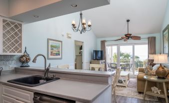 Open the front door to this unit and gaze out to the ocean from the living area's door wall windows. The fully stocked kitchen is open to the great room. The dining table comfortably seats 6. The great room has comfy overstuffed furniture. Grab a good beach and hunker down or flip on the large Smart TV. Sliding doors lead out to the expansive deck. The deck has access from both bedrooms, as well as the living room. On the deck you have multiple seating venues. Dine at the table with seating for four, relax on the couch or take a cat nap on one of the chaises!