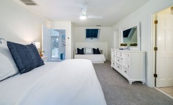 The home has five bedrooms each with a Smart TV. Off of the living room is the Primary en-suite. A king bed awaits your peaceful dreams. This bedroom has a 55" TV and a door leading to the back deck. You have views of the marsh from this bedroom. The primary bathroom has been renovated. A dual sink vanity, large tiled walk-in shower, and private toilet room makes this a relaxing retreat. Off the kitchen is the first of four guest bedrooms. The bedroom has a queen bed and 55" TV. For those who need to work while on vacation a built in desk area is in this bedroom. The bedroom has an en-suite bath featuring a shower.
