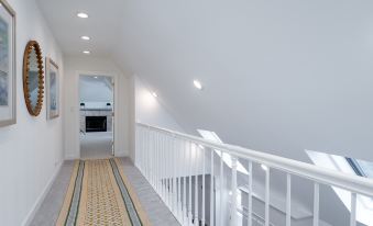 Take the center stairs to the second floor. On the second floor all of the rooms have been carpeted. The top landing can be used as a secondary living space. The kids can hang out and play board games or cards. Sliding doors lead from the landing to the second floor back deck. This upper deck has a spiral staircase leading down to the first level back deck. Guest bedroom two has a 55" wall mounted TV, queen bed and twin size day bed. A desk is in this room. The en-suite for this bedroom has a large vanity area, walk-in shower and skylights. Guest bedroom three has a wall mounted TV, walk-in closet, and a queen bed. The en-suite bath has a single sink vanity and a tub/shower combo. A final guest bedroom sits at the end of the hall and is a perfect space for the kids! This bedroom is oversized and has both sleeping and living space with angled ceilings and ship lapped walls.. There is a queen bed and a twin size daybed. Large cubbies run the length of the room and provide plenty of storage. Hang out on the oversized sofa and watch the 65" TV. The private bath has a shower and single sink vanity.