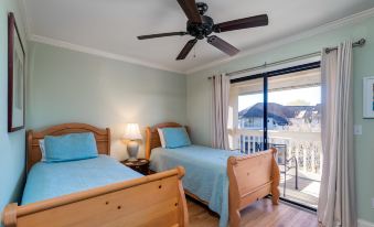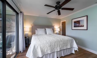 The master bedroom has a new King bed, en suite bath and access to the screened porch. Watch the morning news on the TV. The remodeled bathroom features a modern vanity with a glass counter and sink. The large shower is tiled and has glass doors and a handheld shower head. The doors offer views to the tidal marsh. The 2nd bedroom has two twin beds and sliding doors leading to an open deck. A fan has recently been added to this bedroom. The hall bath has been updated and features a shower/tub, tile flooring and new vanity.