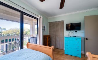 The villa has an open living area featuring hardwood flooring and doors leading to a screened porch with marsh views. Share stories from your day while relaxing on the comfortable furnishings. Watch your favorite shows or movies on the large HDTV. Step to the screened porch and sip cool drinks around the table or settle in the chairs with a book. At dinner time, gather around the table for 4. There is additional seating for two at the kitchen bar. The open kitchen features stainless appliances and new butcher block counters. The stacked HE washer/dryer are hidden behind a sliding door in the living area.