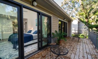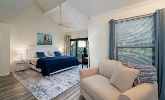 At the end of the day retreat to the expansive, primary bedroom. Here you will dream peacefully on the King Tempur-Pedic Mattress Highlights of the master suite include a 43" Smart TV, work desk & chair, a large sleeper chair, and access to the villa's full-length deck. An adjoining spa-like bath features lots of storage and a tiled shower/tub with spa shower head. The master suite has access to the utility room with the new GE stacked washer and dryer. In the alcove, hang the day's beach bags and hats on the coat hooks and store sandals under the bench seat. An additional full hall bath with shower can be found off the living room. This bathroom's vanity is ADA accessible. NO PETS ALLOWED
