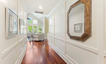 Three of the bedrooms, including the king primary suite, are located on the main first floor, while the unique fourth bedroom is found just up the stairs. This bedrooms doubles as sleeping space and a second living room & entertainment area. Each bedroom has a private bathroom and there is a half bath for guests on the main floor.