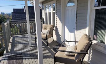 Charming Greenwood home with 2 bedrooms and one full bath, hardwood floors, large kitchen w/eating space opens to deck, gas heating fireplace in living room, dining room, ceiling fans, gas cooking, laundry, desk in front room, high speed fiber Internet, large rear deck with BBQ & patio set, large front porch/deck with sitting area & views of sunsets & the Olympic Mountains. Walk to all Greenwood has to offer (Wingdome, Valhalla, Pete's Egg Nest, Diva Espresso, Taproot Theater, & much more). 16 minutes from downtown Seattle. Easy access to Green Lake, Ballard, highway 99 and the I-5 corridor. 7 min to the Burke Gilman trail and Ballard. This is for the main floor unit A.About pets:No pets allowed.About checkOut:Check out before 11:00 AM.About children:Children allowed: ages 13-17.About customRules:This home was built in 1916. Do not flush anything.Renters must be considerate of noise transfer to t,Parking is not allowed in the driveway. Driveway i.About checkIn:Check in after 4:00 PM.About smoking:Smoking is not permitted.About minBookingAge:Minimum age to rent: 25.About events:No events allowed.