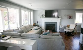 The main floor of the home boasts an open floor plan with a beautiful, chefs kitchen with a double oven and large island, a large live-edge dining room table and a spacious living room with a cozy gas fireplace and 65" TV all hooked up to Netflix, Hulu and Amazon Prime Videos. We have an amazon Alexa on the main floor as well as surround sound for movies or that you can connect to your phone for music over bluetooth. In the living room area there is a huge super comfy deep down couch. It can see about 7-10 people comfortably. There is a front porch to enjoy your morning coffee and a back porch with a BBQ.