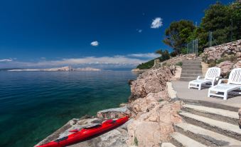 3-family house "Starigrad". 300 m from the centre, 20 km from the centre of Sveti Juraj, in a quiet, sunny, elevated position, 30 m from the sea, 30 m from the beach, in a cul-de-sac. For shared use: property 720 m2 (fenced), plants. In the house: internet access. Parking at the house on the premises. Shop 20 km, restaurant 13 km, bus stop 3.3 km, rocky beach, concrete beach 30 m. The owner does not accept any youth groups. 2-room apartment 50 m2 on 1st floor, south facing position. 1 room with 1 french bed (160 cm, length 200 cm), air conditioning. 1 room with 2 beds (90 cm, length 200 cm). Dining room with satellite TV. Exit to the terrace. Open kitchen (oven, 4 ceramic glass hob hotplates, freezer, electric coffee machine). Shower/WC. No heating option. Terrace 10 m2, roofed. Terrace furniture. Marvellous view of the sea. Facilities: Internet (WiFi, free). Maximum 1 pet/ dog allowed.
