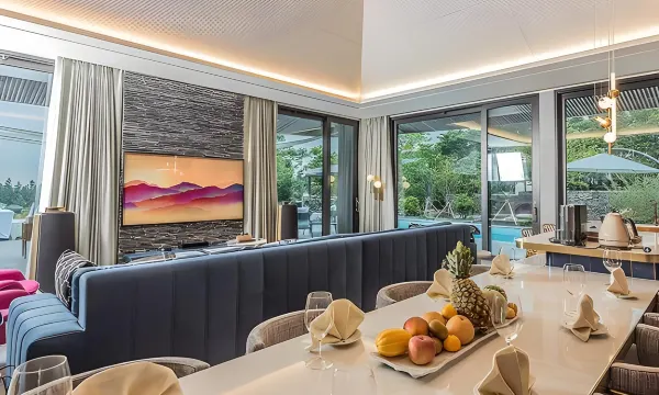 酒店坐落於濟州島中部山區,漢拿山西南山麓,佔盡地理之宜,設計師以獨特的審美眼光設計的形狀像葡萄的建築,發揮出韓國傳統審美空間。酒店內的裝飾極具高級感,硬質火山巖地坪,大膽採用紅色、青色、黑色等大塊撞色設計,配以獨特設計的裝置雕塑藝術品,