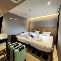 Отель находится примерно в 8 минутах ходьбы от станции метро, но до главной улицы Хондэ всё же больше 1 км. В номере помещаются два 24-дюймовых чемодана, но если их открыть, места уже не останется. Комната довольно чистая, есть бутилированная вода и завтрак. На первом этаже есть прачечная. Соотношение цены и качества очень хорошее.