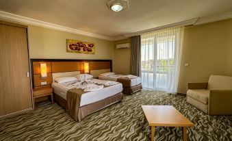 Встретили отлично, на ресепшене русскоговорящий Сергей всё подсказал, объяснил. Номер малюсенький из за того, что кроме двухспальной кровати стоит ещё односпальная. Не работали ни телевизор, ни холодильник. Чайник был и кофе и чай и сахар пополняли. Убирались хорошо, видно было по балкону и санузлу. В комнате засаленный ковролин и тапочек и халатов не предусмотрено. Сейф 3 евро день, мы не брали. Полотенце 1 евро день в прокат, тоже не брали. Так как было начало мая шведский стол отсутствовал. Но голодными ни разу не ушли. Что давали, то и ешь. Не удобно и многое просто выкидывалось, потому что мы это не ели. Чай и кофейный автомат и сильно разбавленный лимонад в свободном доступе с утра и до 22:00. Также с 17 до 18 перекус- печеньки. Море недалеко в пяти минутах, спокойное без волн, купались. Бассейн на территории с горкой очень маленький и холодный. В общем за такие деньги не плохая турбаза на море. Туристов было мало. Но это деревня, чтобы развлечься надо куда то ехать, рядом остановка автобуса. Ездили в Белек и парк Легенд, очень понравилось.