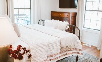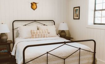 When you enter The Urban Cottage, you will enjoy open concept living where the fully equipped kitchen overlooks a rustic-chic living area. We designed the cottage with nature in mind, so you will find organic, natural elements throughout the cottage in the form of marble, wood, leather and stone! The kitchen has true Carrara Marble countertops, locally-made hickory hardwood floors, black walnut open shelving hand crafted by a local artist from Cobbly Nob. Curl up and enjoy the ambiance of the wood-burning fireplace while lounging on the leather sofa and Sherpa chairs in this lodge style cottage!