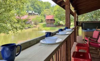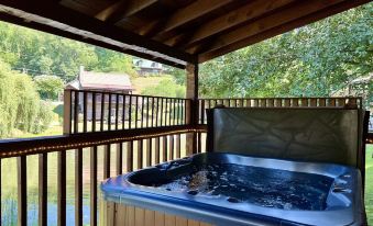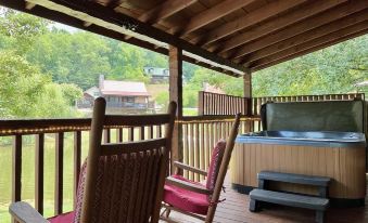 The front porch overlooks the stocked catch-and-release fishing pond. Even if you re not a fisherman, it s fun to sit by the water and watch the fish and turtles swim by. Or if you prefer to relax IN the water, try the hot tub on the covered porch. It s a newer hot tub in excellent condition and features a cover lift. No having to drag a bulky hot tub cover off and on. We've installed white rope lights for added nighttime ambience. And during the day, play corn hole in the yard. There is even a fire pit for cool evenings. This is the perfect low-tech, relaxation everyone can enjoy.