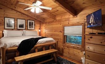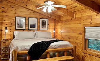 There is a full bed in the first floor bedroom, a king bed in the large open loft, and a twin bed on the other end of the loft. Each level of the cabin has a full bath and the bathroom in the loft features a jetted tub, perfect for a quiet soak. Both the king & full sleeping spaces feature a 32" flat screen smart TV to stream your favorite shows.