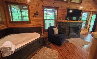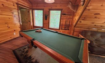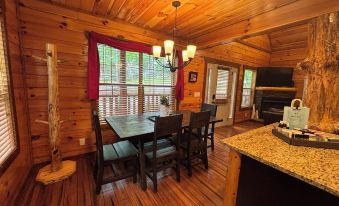 Our cabin is a spacious, 2-bedroom, 2-bathroom cabin that comfortably sleeps up to 8 people. With 1 king-sized bed, 1 queen-sized bed, a queen-sized sofa bed, and a full-sized futon. Our cabin is located in a wooded area and includes the adjacent lot for more privacy. It's located in Sky Harbor, just beyond the main strip in Pigeon Forge. It’s situated in an ideal location- just 15 minutes to Pigeon Forge or Gatlinburg.