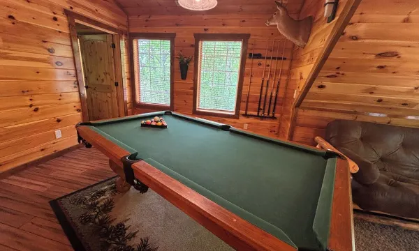 The large master bedroom is located upstairs, complete with a separate, jetted tub, a fireplace, and private deck access. The loft area includes a slate-top pool table and a full-sized futon.