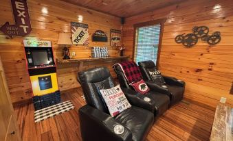 The main level offers a fully stocked kitchen which opens up to the living room. You can relax in front of the gas-burning fireplace while lounging on the sofa watching the flat screen t.v. or reading a book. Enjoy the handmade log furnishings throughout! The main level also features a theater room with a huge projection screen and surround sound. There is a bedroom on this level with a queen-sized bed and a private television. You'll have access to the five-person hot tub on this level as well!