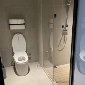 (Если бы мне пришлось указать на недостаток, это было бы отсутствие душевой кабины с верхним душем, только обычная душевая лейка, а удобства довольно простые. Однако, учитывая цену, это того полностью стоит. В номере есть холодильник, умный унитаз, а кондиционер очень мощный и совсем не душный.) (Если цена в будущем повысится, надеюсь, они добавят душевую кабину с верхним душем.)