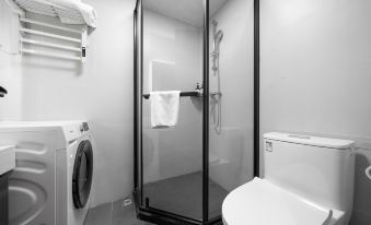 房間挺大的,還有大投影幕布,有騰訊會員可以看各種電影電視劇綜藝,有冰箱可以放飲料這些很不錯,有洗衣機不過還沒使用過,樓下有小吃店,這個桂林米粉個人覺得味道不錯!