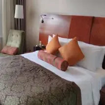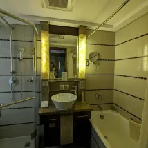 Санитария и обстановка в номерах хорошие, но сантехника и отделка немного устарели, но всё это старые бренды, и проблем с пользованием нет. Номера стандартные для старых четырёхзвёздочных отелей. Также есть сейф, небольшой холодильник, гладильная доска и запасные одеяла. Соотношение цены и качества хорошее.