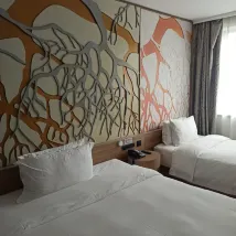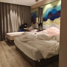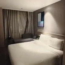 Номер очень чистый и опрятный, со всеми удобствами. Есть даже небольшой робот, который доставляет еду. В отеле также есть стиральная и сушильная машины, которые можно бесплатно опробовать. Персонал на стойке регистрации очень приятный и вежливый. Уборщица тоже очень хорошая и убирает каждый день. Отель расположен совсем рядом с линией метро 2, что обеспечивает удобную транспортную развязку. Также есть автобусы, что позволяет легко добраться до туристических достопримечательностей.