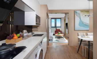 非常讚的酒店式公寓,很適合帶孩子出行,廚房廁所設施非常全,鍋碗瓢盆也很全,一室一廳也很寬敞舒適,還有小小的湖景!