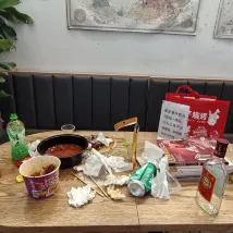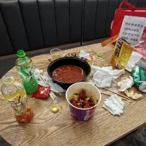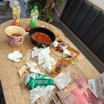 И ещё, что особенно расстраивает: хотя персонал начал уборку уже в 6-7 утра, но уже почти 8 часов, а на столах по-прежнему царит хаос, грязь и вонь. Это просто безответственно!!!