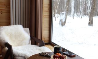 房間温馨,獨特,設施齊全,服務舒適,每一位員工都洋溢着笑容,以及不失分寸的熱情,不自覺讓人心生歡喜,這裏的夜晚很安靜,許久沒有睡的這麼深沉了,清晨走在門外的小路上,腳下的雪發出“咯吱咯吱”的聲響。遠處的雪山,在陽光的照耀下閃爍着迷人的光芒。白樺林,靜謐,無人,粉雪被寒風裹挾在空中閃爍,細細的,亮亮的,很晃眼,像童話,在這裏我看到了心目中雪該有的樣子,遠處裊裊炊煙映襯着黑山白水和低矮的木屋,我們沉默的走在雪地裏。恍然間以為自己回到了會借動畫片做白日夢的童年。