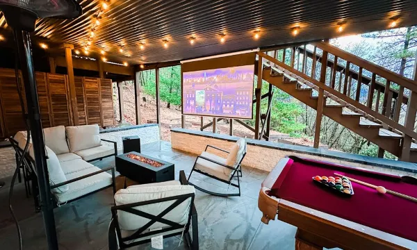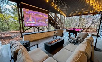 *A very unique covered FOREST LOUNGE is what we built to offer you one of the most memorable experiences ever. You can enjoy your time in the middle of the forest while watching your favorite movie on the 100-inch projection screen around the outdoor fireplace or playing pool with your friends and family.*
