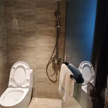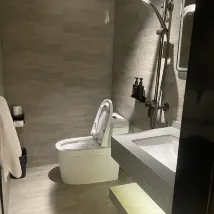 Удобства: Обычные номера очень маленькие, 23-25 квадратных метров, и выглядят по-другому. Дизайн ванной комнаты очень негуманный. Туалет слева, а раковина посередине очень. Компактный. Если вы немного толще, там можно принять ванну. На нее легко наткнуться, если случайно обернуться. В углу раковины только один слив. После душа вся ванная такая же. медленный, как комната с водой. После выхода и возвращения в туалет вода есть, что очень неудобно. Накануне я останавливался в номере люкс. В номере были вешалки для одежды, а в обычных номерах не было. .