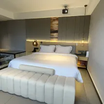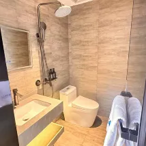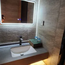 Комната чистая и новая. Есть умное устройство, свет на шторах можно включать и выключать по звонку, есть проекционный экран. Есть достаточно горячей воды для купания. Единственный недостаток - вода в умывальнике. Бассейн сливается очень медленно, в результате чего вода просачивается из земли.