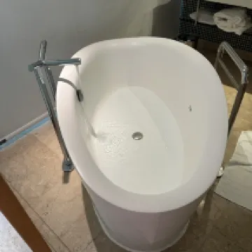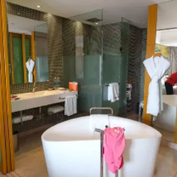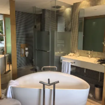 Ванная комната и туалет делят одну дверь, что немного странно. Водоотводная планка в душе не выполняет свою функцию, и после душа вода переливается в соседний туалет. Не было предоставлено основных принадлежностей, таких как шапочка для душа, набор для ухода за собой, ватные палочки. Коробка с салфетками была только в туалете, что очень неудобно, если вы с ребенком. На следующий день около 9:30 утра в ресторане снова была очередь, долгое ожидание и толпа.