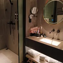 Номер в отеле не слишком большой, но запаха нет. Ванная комната спроектирована так, чтобы разделить сухую и влажную зоны, что очень продуманно. Дизайн номера очень модный, в нем предусмотрены две разные подушки и кабели для зарядки, что очень внимательно.