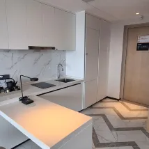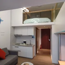 Номер расположен на высоком этаже с видом на озеро. Размер комнаты средний, тапочки мягкие и удобные. Есть стиральная машина и достаточное количество вешалок для одежды. Предоставляются бесплатные закуски, конфеты, бутилированная вода и молоко, что приятно. Однако ванная комната и туалет совмещены, а перегородка между ванной и туалетом прозрачная, поэтому пользоваться всем помещением может только один человек, что неудобно. Чистота средняя: в ванной комнате, на лестнице и в прихожей были волосы и пыль. Также скопилась пыль на вентиляционных отверстиях кондиционера. Надеюсь, это можно исправить. На стойке регистрации только регистрируют заезд и выезд, просто говорят «ОК», не предоставляя никакой другой информации или информации об удобствах, так что о сервисе практически нечего и говорить.