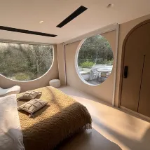 Хоть комната и маленькая, планировка очень продуманная: электрические шторы во всей комнате можно опустить, и открывается вид на гигантский проекционный экран.