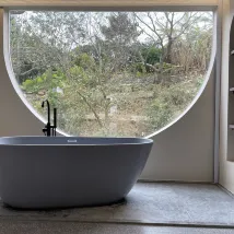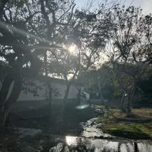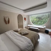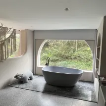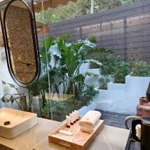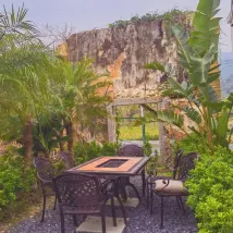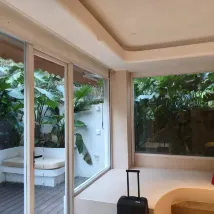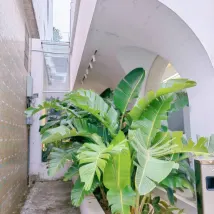 Внешний вид отеля очень красивый, со стеклянным потолочным окном и бассейном над ним, образующим потолок, позволяющий солнечному свету проникать внутрь. В саду сохранились внешние стены старого дома, которые имеют уникальный колорит. За дверью большой травяной сад с пешеходными дорожками, далеко от города, воздух свежий, посажены разные деревья, целуйте природу!