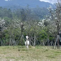 Неправильная навигация привела нас к гостинице типа «ночлег и завтрак» на вершине горы, но мы действительно увидели это, когда свернули на перекрестке Тяньцзо Нонгцзяйцай. Перед отелем есть зеленый луг с небольшим мостиком и проточной водой. Расположение очень хорошее. Гостей развлекали альпаки и восторженные собаки, и малышка была очень взволнована.
